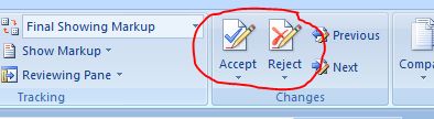5. Accept or reject changes. Use the Accept and Reject buttons to on the ribbon to finalize or undo each suggested change. If you click on the little arrow just beneath the Accept icon, you’ll get a menu that gives you the option to accept all changes in the document in one step.