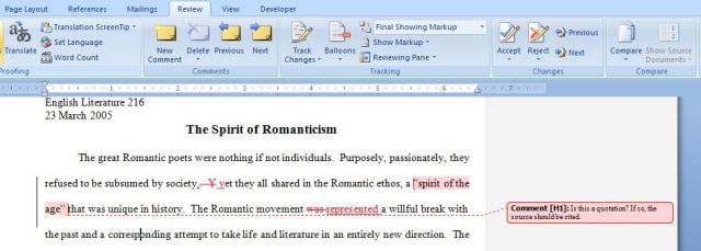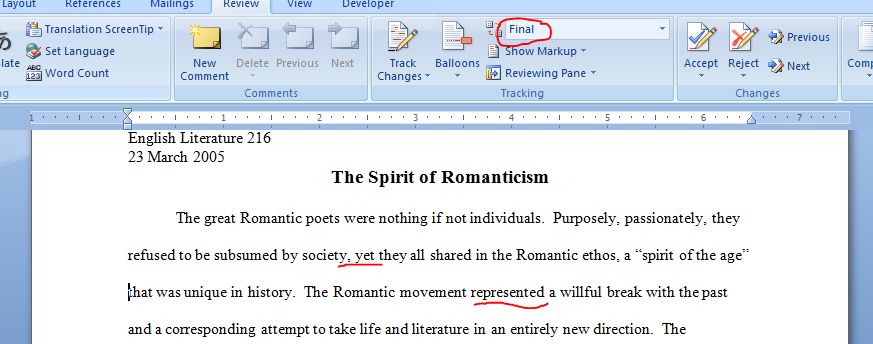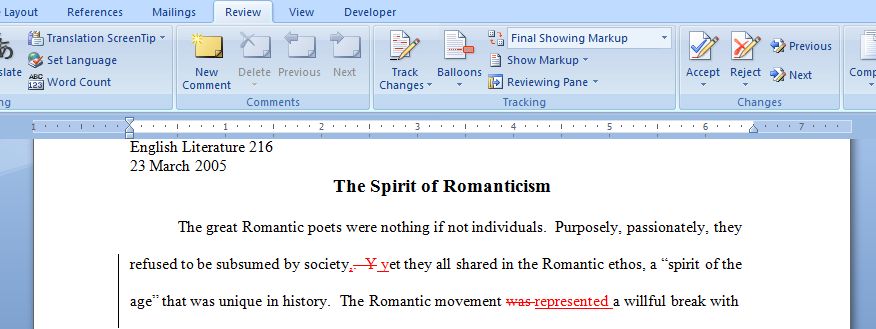 2. Look at the changes. For the screenshot below, I made a few revisions to a paper I wrote as a college freshman – you can see the red markings and type where I have changed some punctuation and replaced one word with another. (The first round of changes will usually show up in red. If you or another reader make your own tracked changes, they will appear in a different color.)