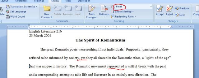 4. Look at the changes in context. It can be hard to read a document and get a sense of what the changes actually accomplish when you’re distracted by the markings themselves. To read the document as it will appear after the tracked changes are implemented, change the tracking view from “Final Showing Markup” to “Final.” Note the highlighted points, where the text has been altered.